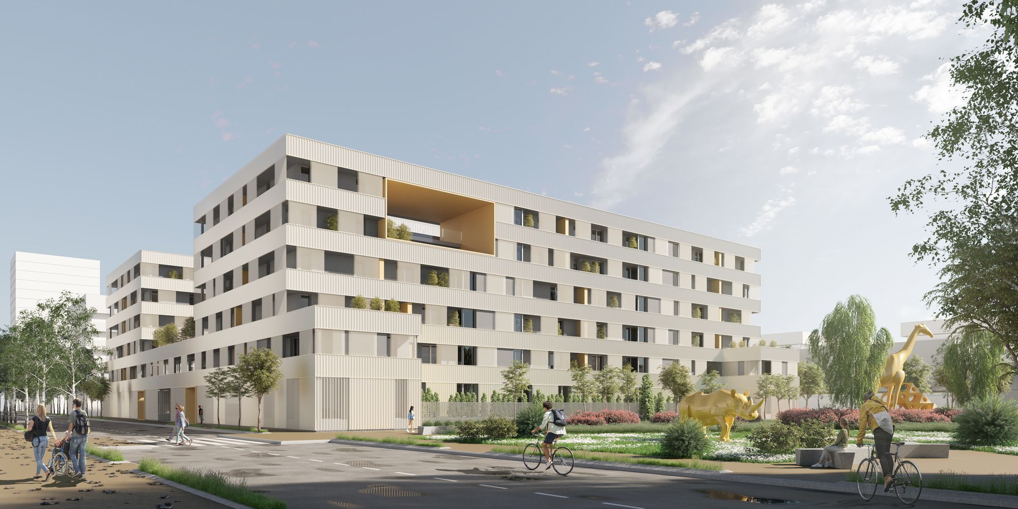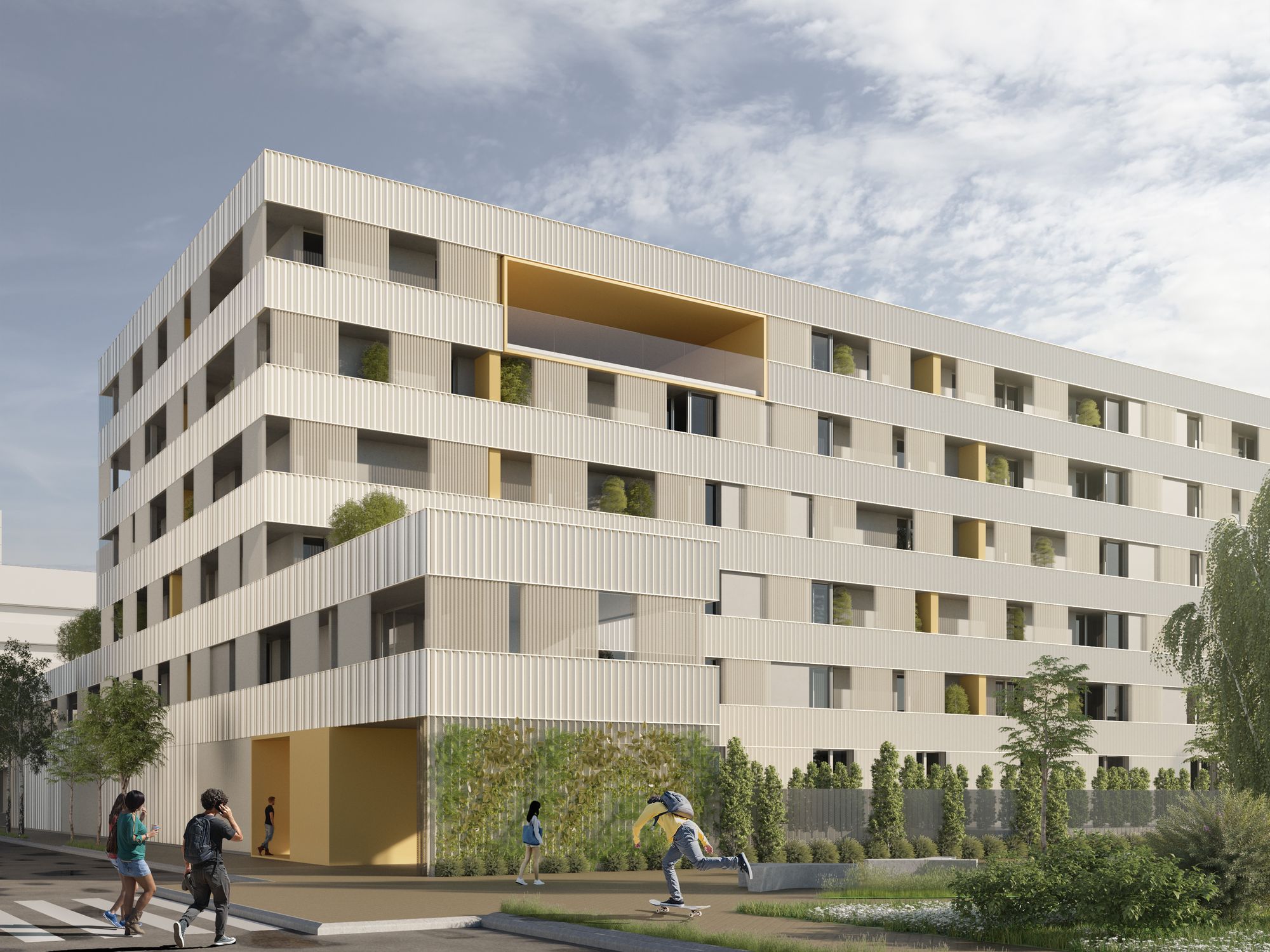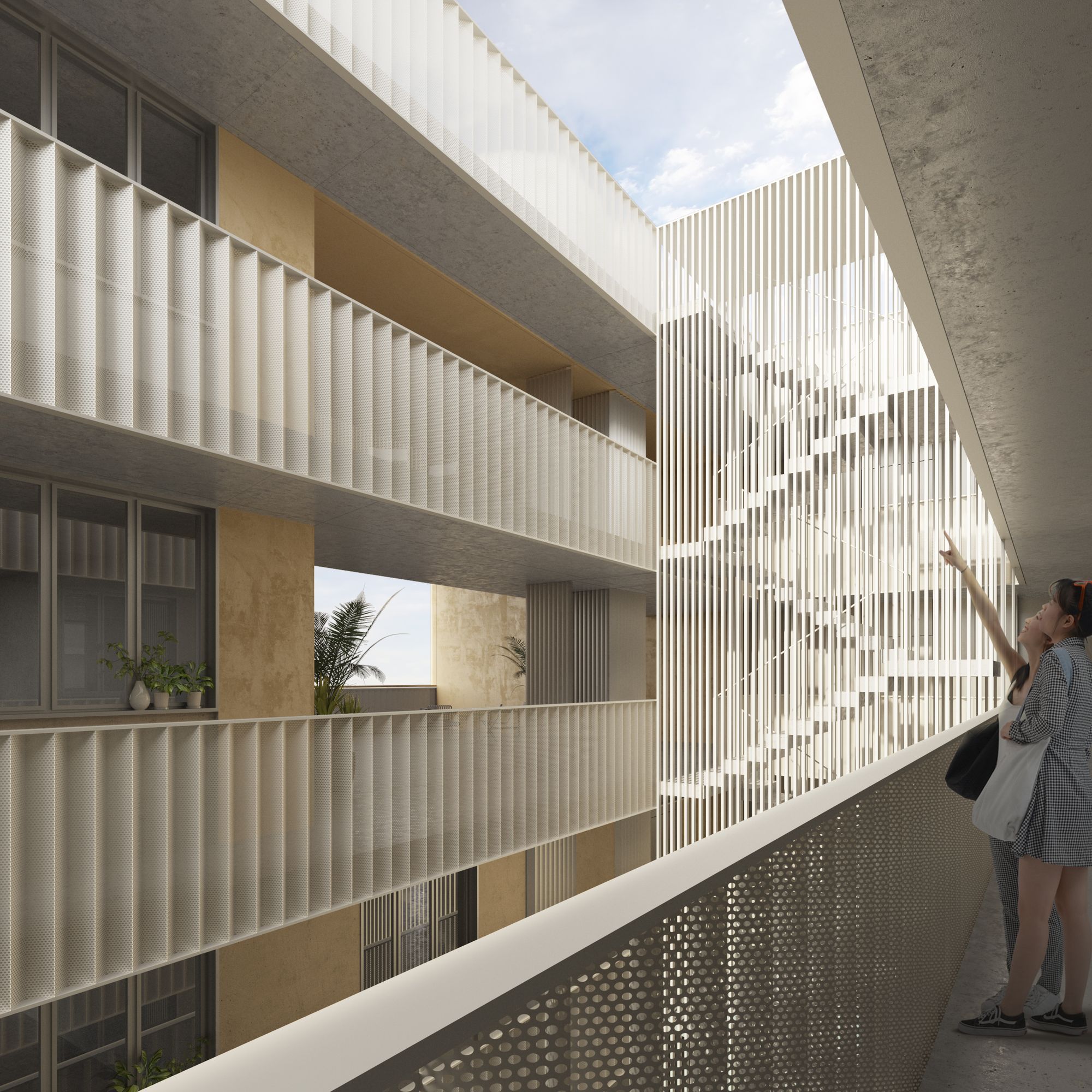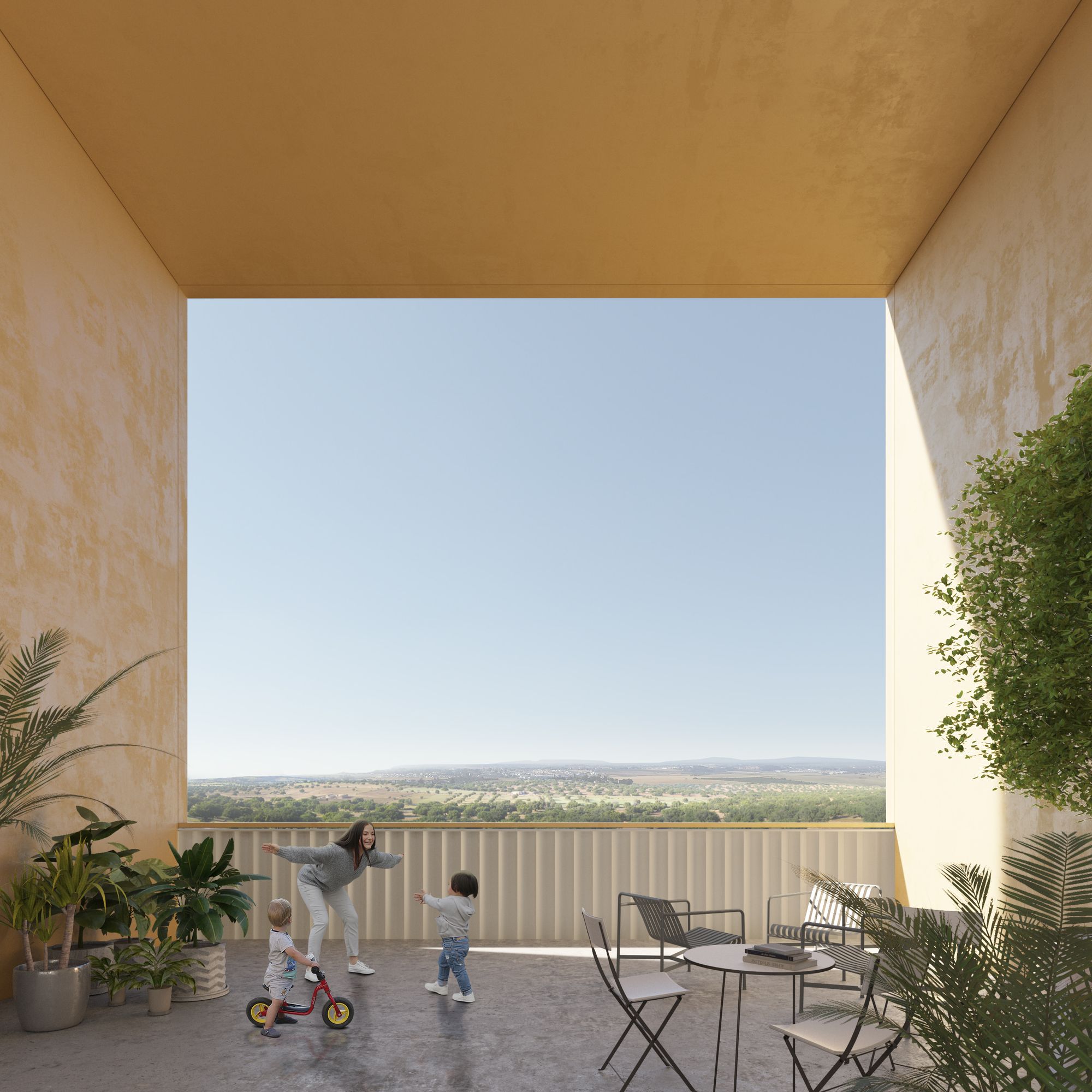 Añade un nuevo grado de flexibilidad y polivalencia al dotar de todas las viviendas de un lugar al aire libre de uso privativo, dando respuesta a situaciones de confinamiento social, así como otras de uso comunitario con un gran potencial de mirar sobre el paisaje.